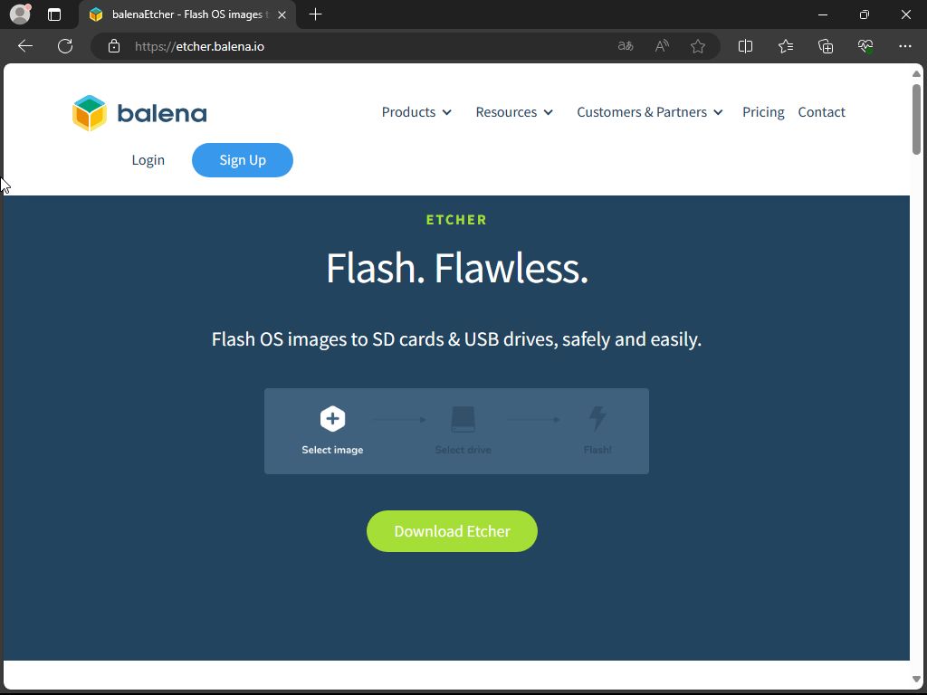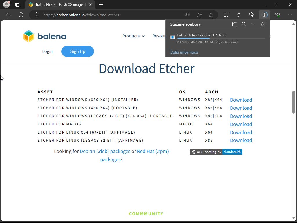 Otevřeme si webové stránky balenaEtcher a klikneme na tlačítko Download Etcher.