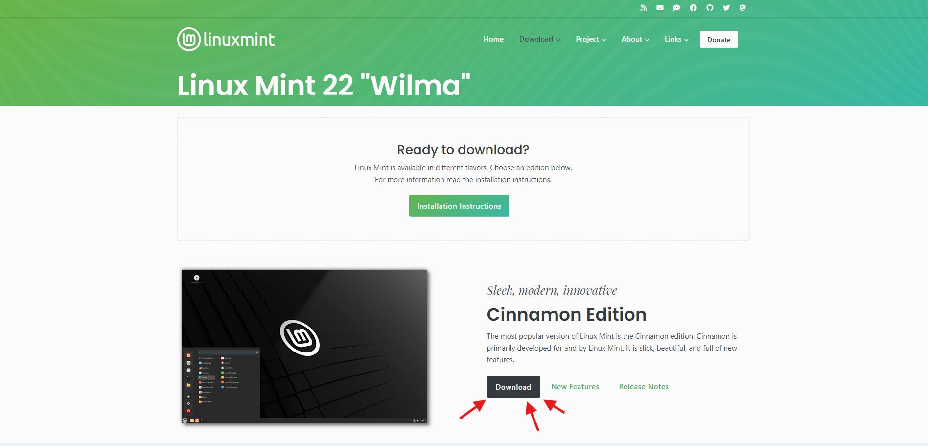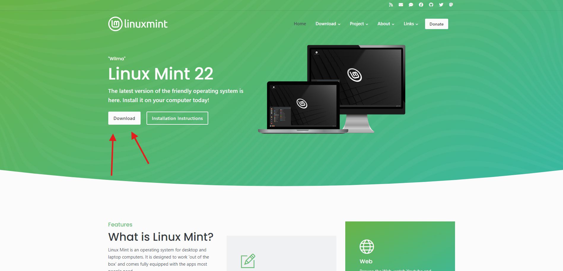 Otevřeme si stránky Linux Mint a klikneme na tlačítko Download.