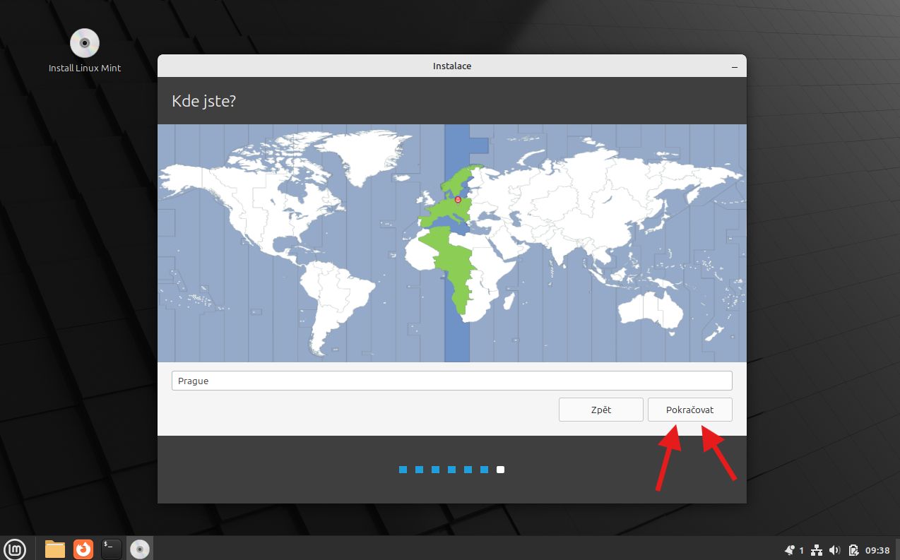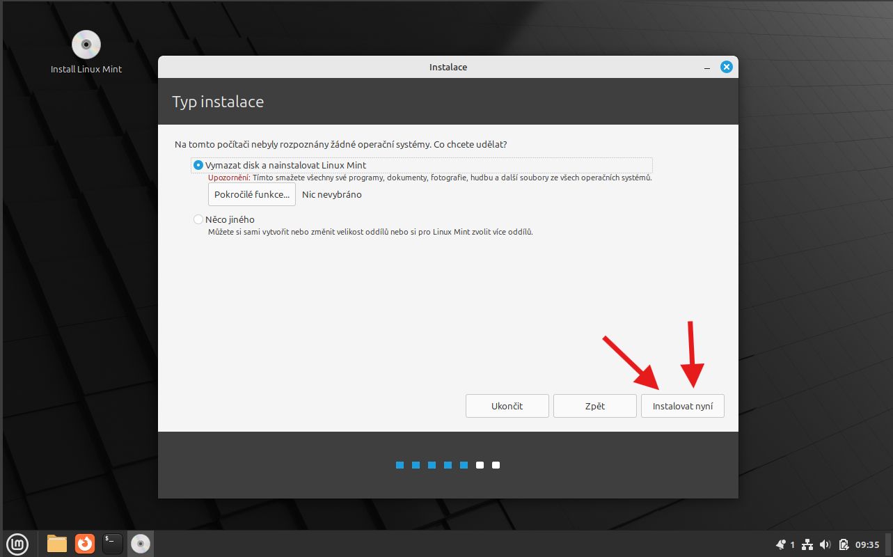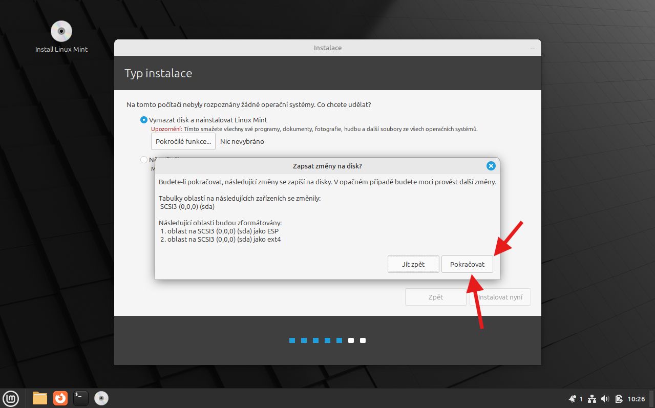 V sekci disku zvolíme možnost Vymazat disk a nainstalovat Linux Mint, potvrdíme zapsání změn disku.