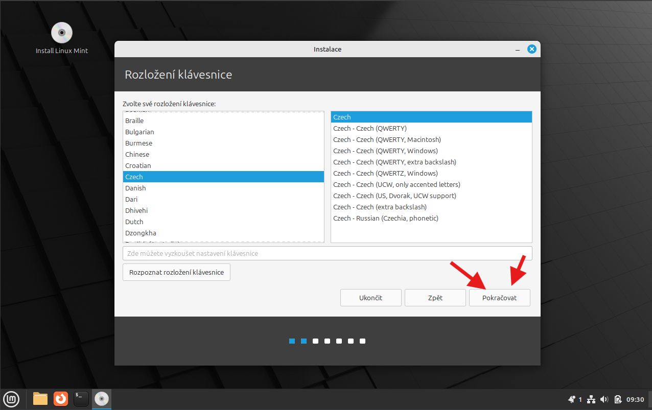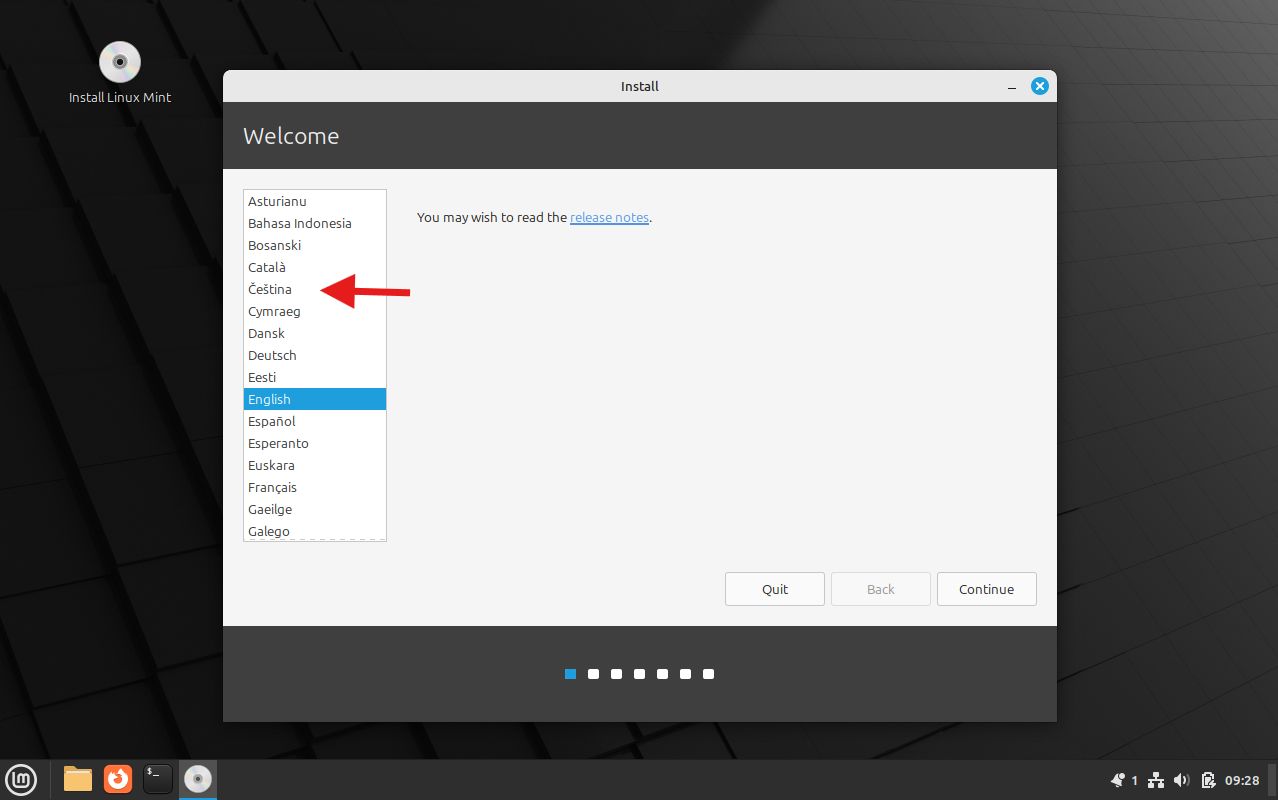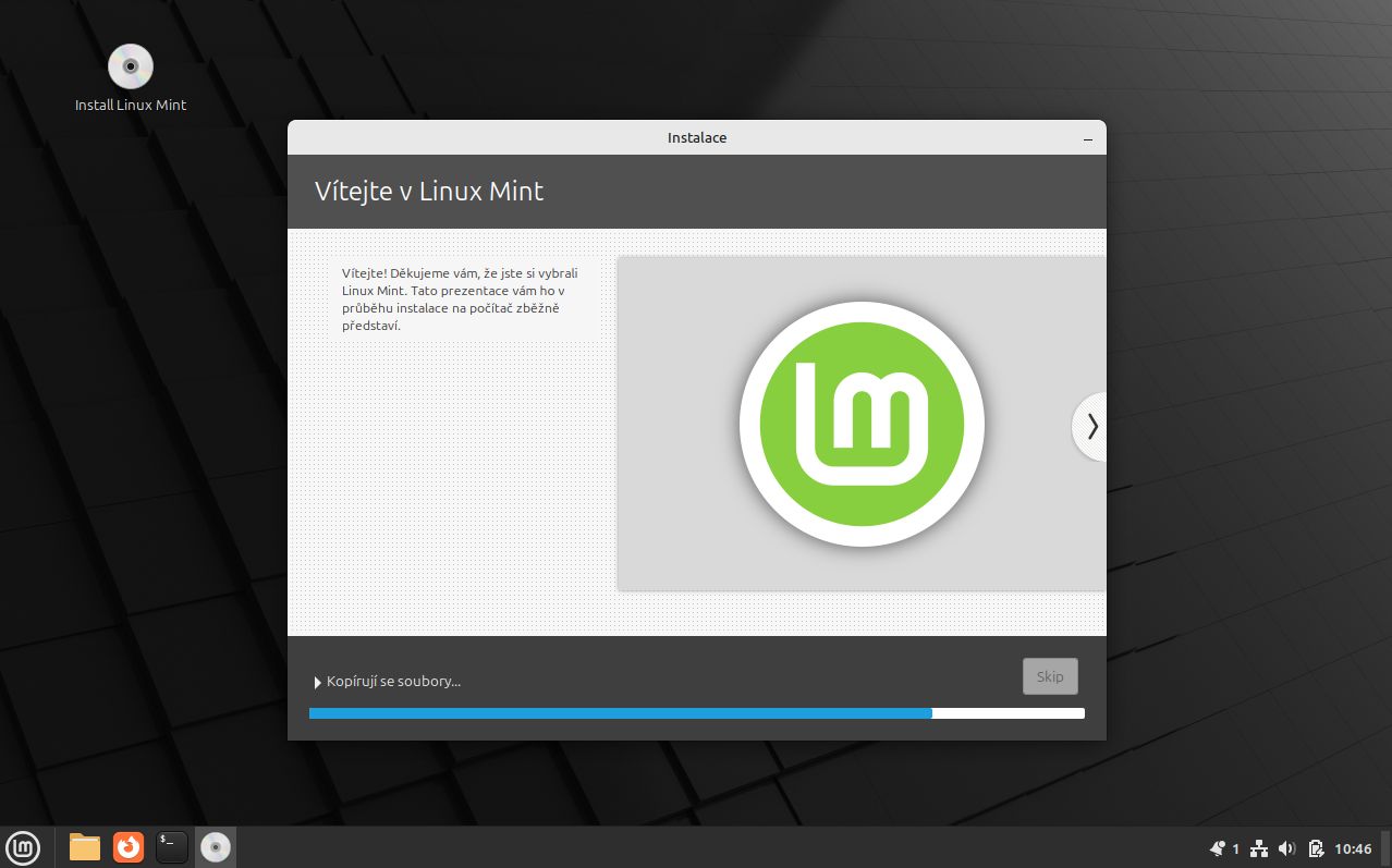 Úspěšně proběhlo načténí nového Linux Mint z disku s úvodní obrazovkou.