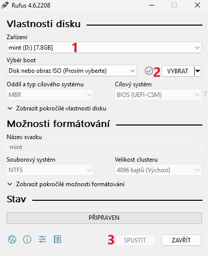 Pomocí programu Rufus zapíšeme stažený ISO soubor na flash.