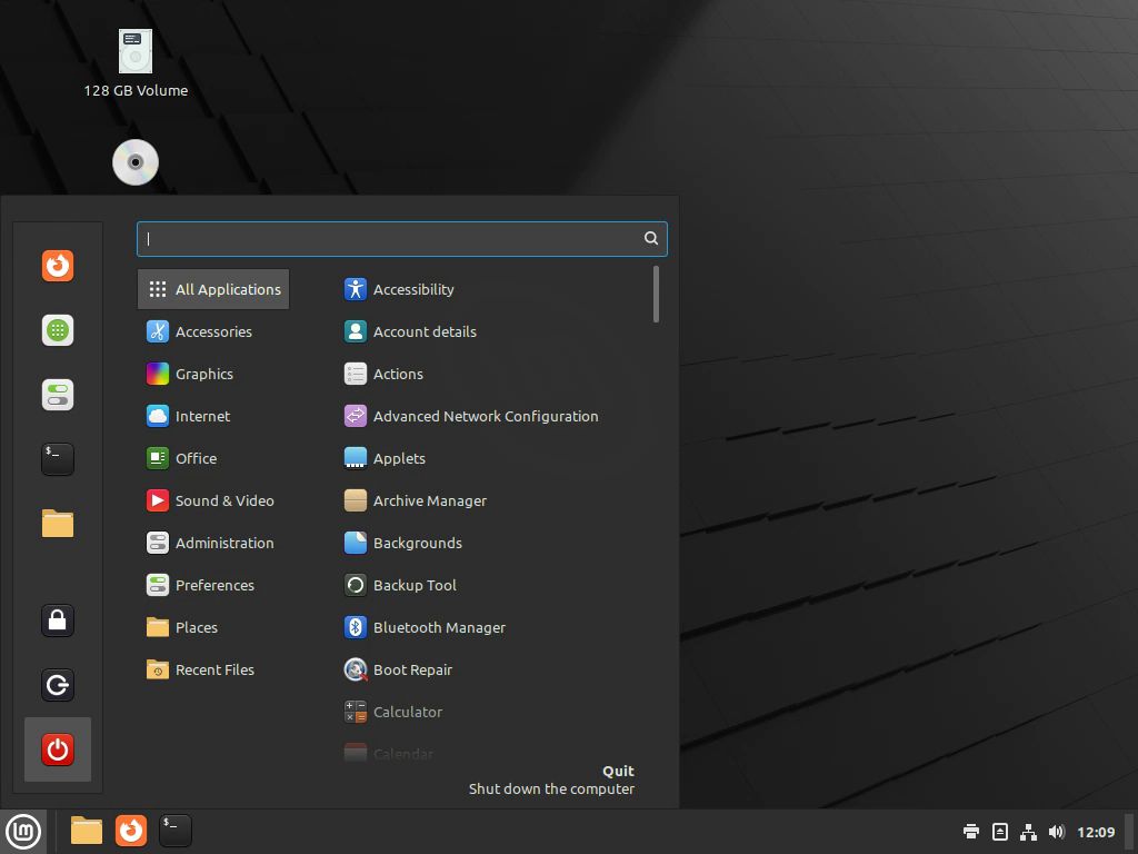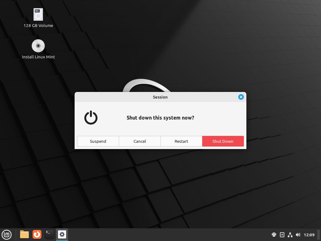Po ukončení veškeré práce s obnovou a odpojením disků můžeme ukončit práci v Linux Mint. Klikneme na start (symbol Linux Mint), symbol vypínače (červené tlačítko), vybereme Restart = restartovat nebo Shut Down = vypnout a vypojíme Flash disk.