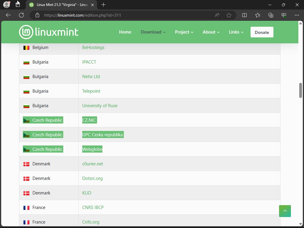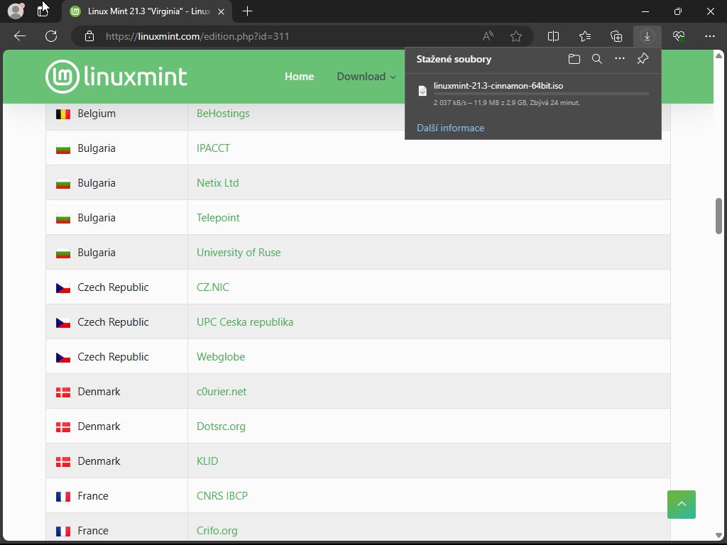 V této části stránky sjedeme níže v Download mirrors na řádky Czech Republic, vybereme libovolný odkaz a bude zahájeno stahovaní ISO souboru.