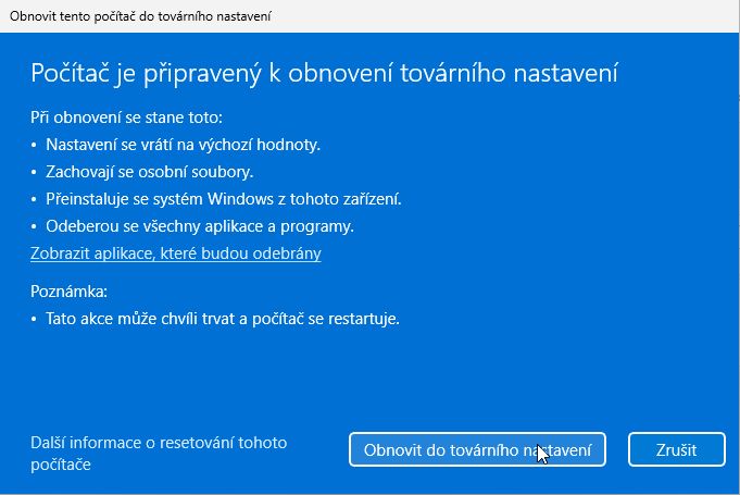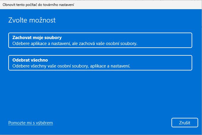 - Zachovat moje soubory = tuto volbu volí většina uživatelů, protože nemají nebo nezálohují data. Zvolíme tuto možnost pro náš test.