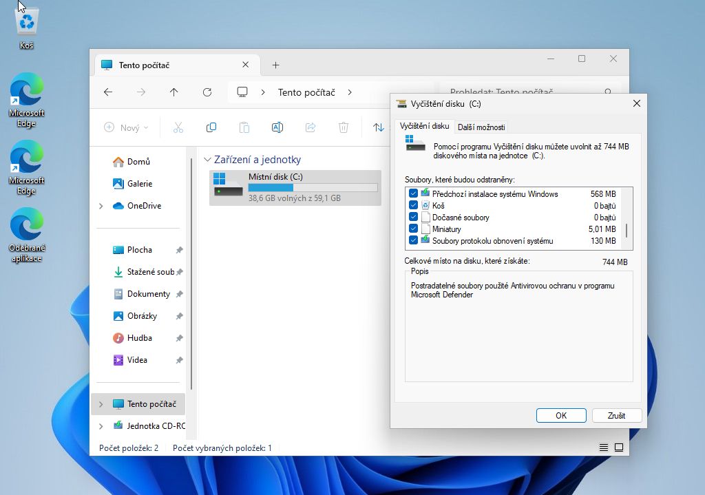 - Vyčištění disku: 744 MB (zbytečné soubory po instalaci k odstranění)