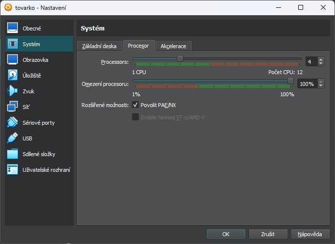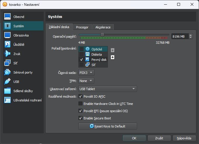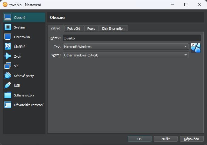 Jako příklad jsem vytvořil virtuální počítač ve VirtualBoxu s následujícím nastavením: