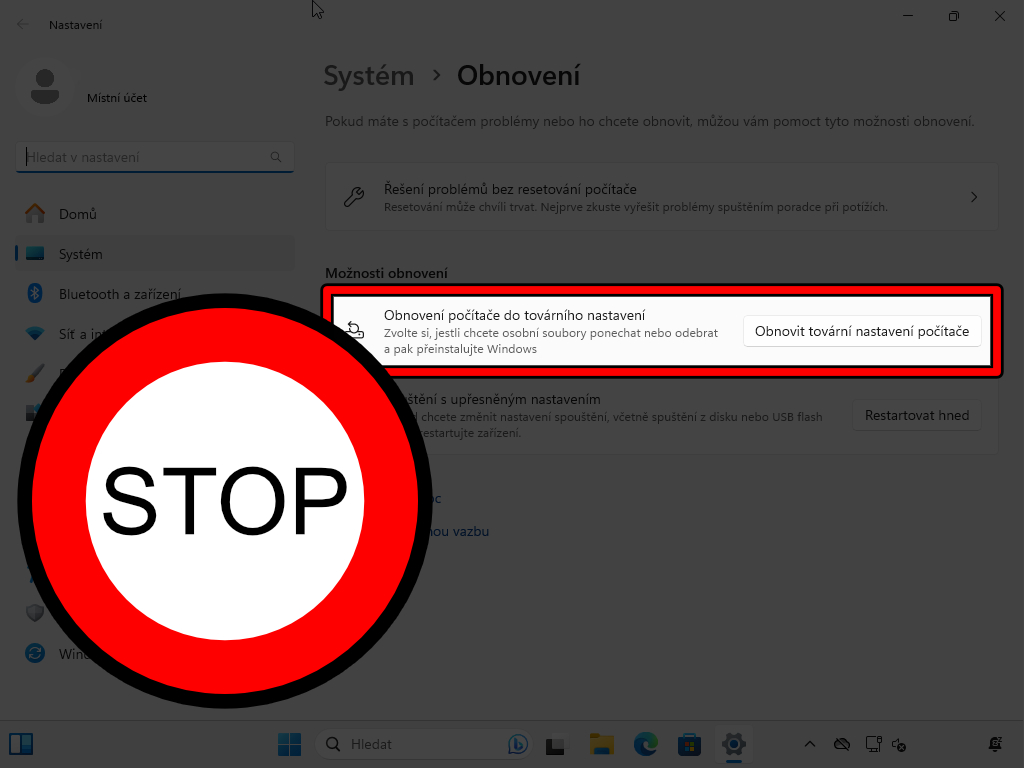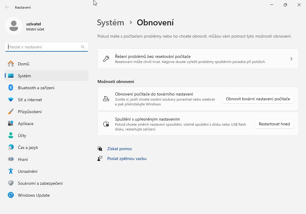 Obnovu počítače do továrního nastavení najdeme v NASTAVENÍ -> SYSTÉM -> OBNOVENÍ.