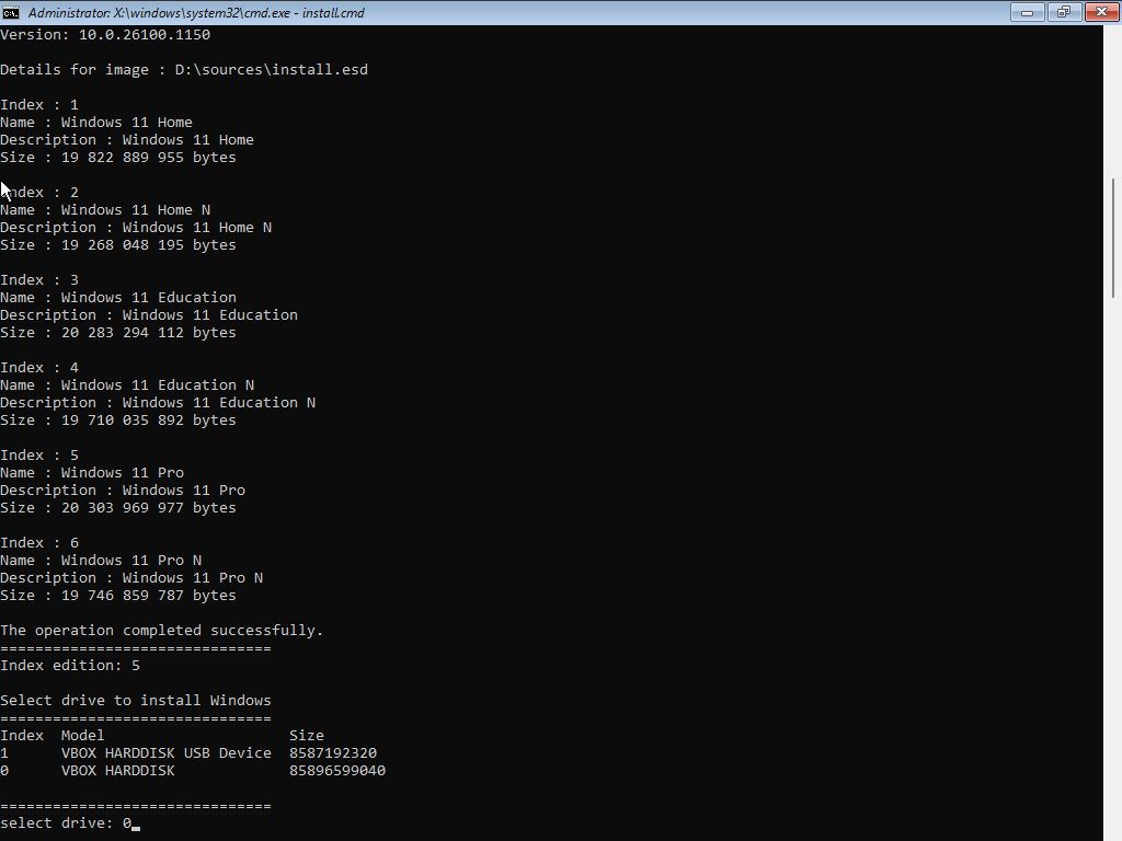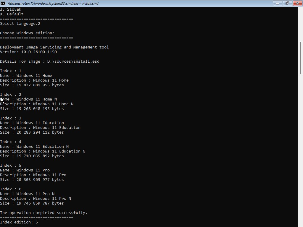 Zvolíme číslo požadované edice Windows pro použítí k instalaci. Např.: 5 - Windows 11 Pro.