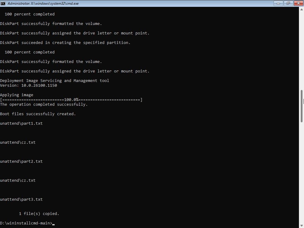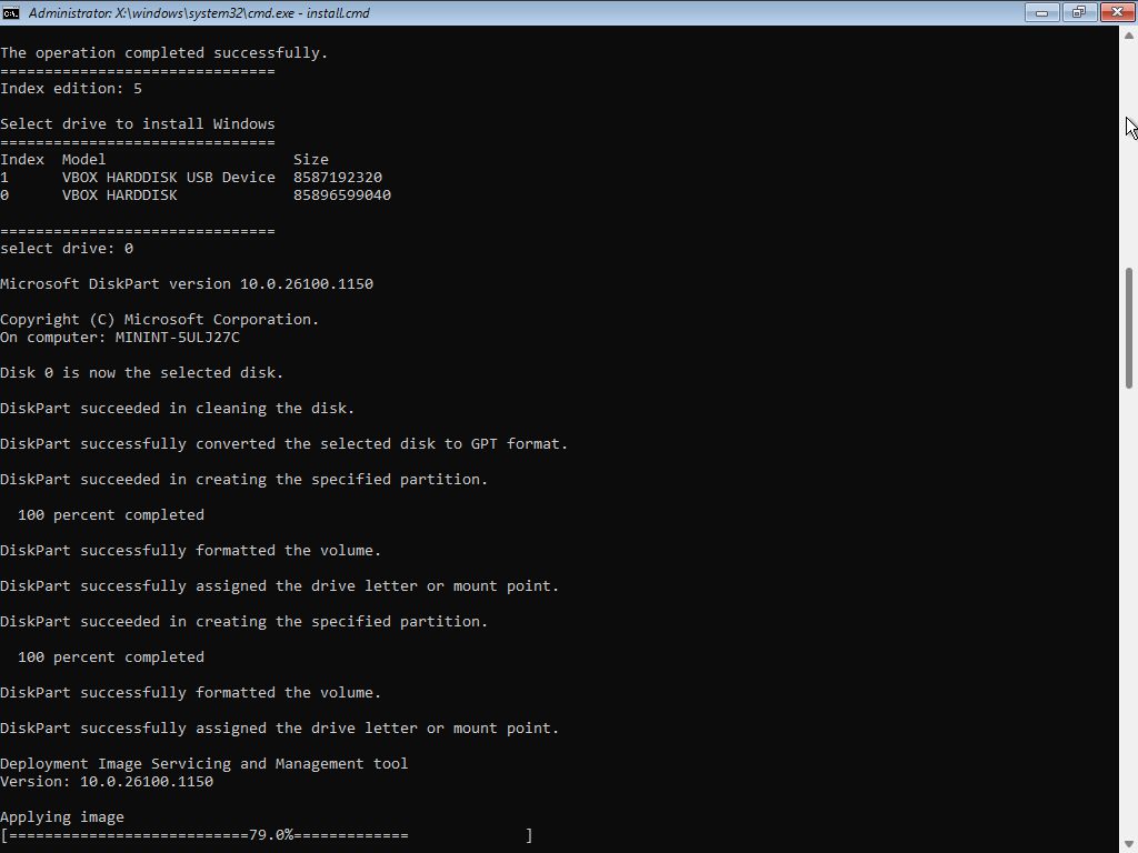 Script využívá nativních funkcí samotého systému jako je Diskpart pro konfiguraci disku a konfigurační soubor Unattend pro automatizaci instalace systému.