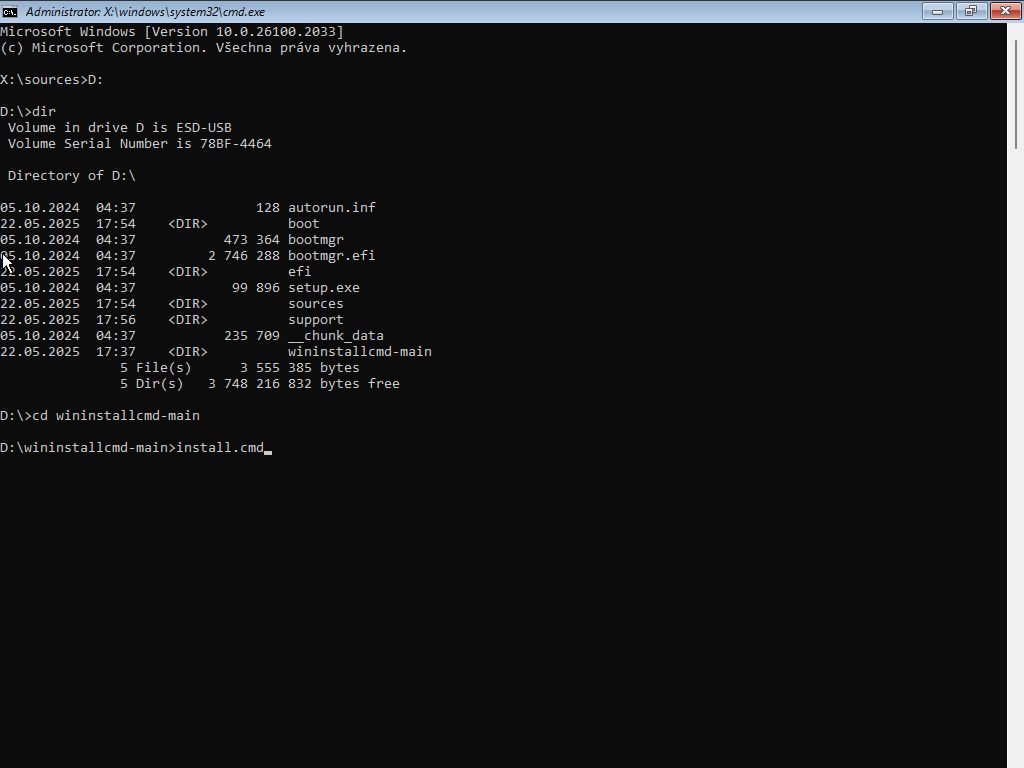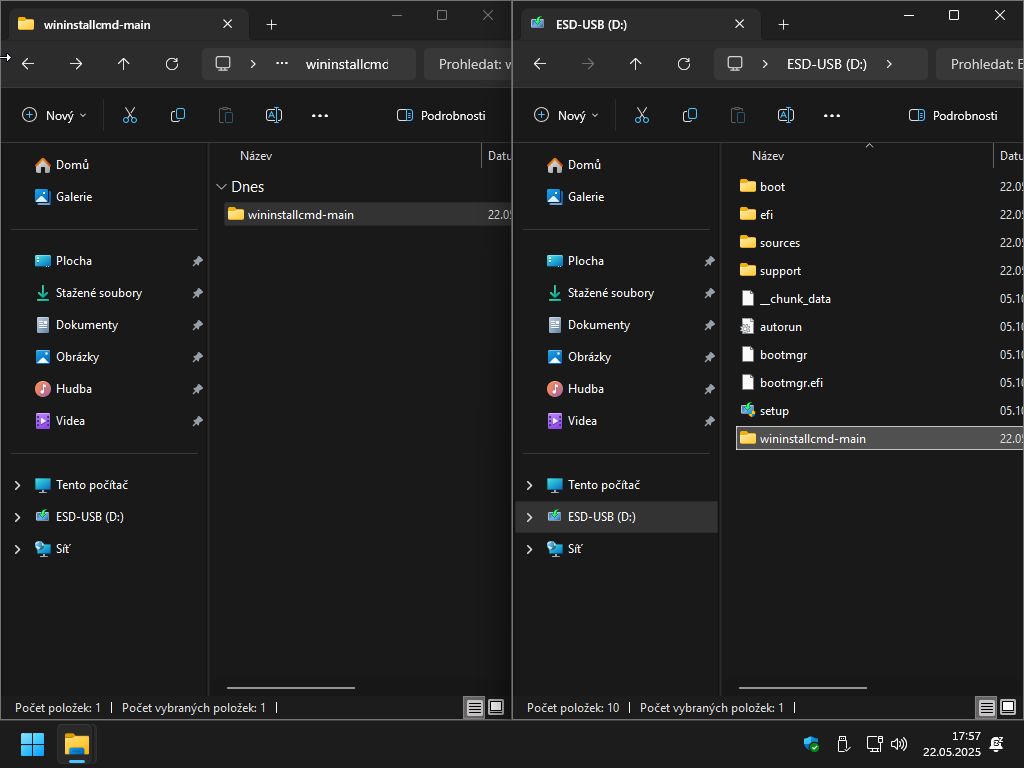 Stažený a rozbalený archív (složku) přesuneme na Flash disk s Instalací Windows. Je to složka wininstallcmd-main, která obsahuje soubor a složku: install.cmd a unattend.