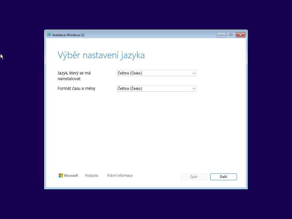 Po zobrazení úvodní obrazovky instalace stiskneme klávesovou zkratku SHIFT + F10, která nám otevře Příkazový řádek.