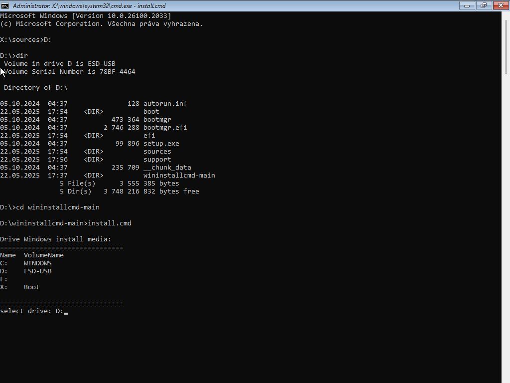 - Lokalizujeme písmeno flash disku s instalaci a scriptem. Příkaz: D:.